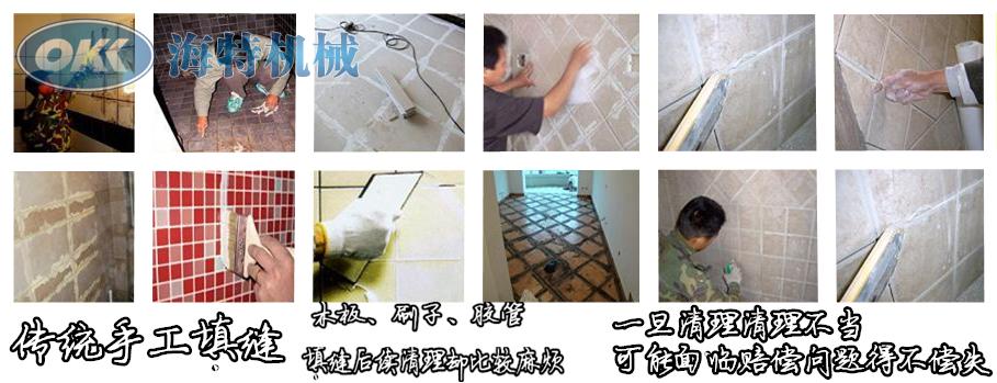 而 在這些縫隙中填入粘結(jié)劑成為填縫,傳統(tǒng)填縫方式則是采用人工用木條、鐵板甚至用手,小量的將粘結(jié)劑慢慢填補(bǔ)縫隙,或者大面積抹涂后再針對縫隙大小,用鐵線 對準(zhǔn)縫隙慢慢壓平粘結(jié)劑,等待物料干結(jié)后再清洗磚面,遇到光滑面磚可以清洗干凈,如磚面是亞光或者不平整文化磚,則無法清洗,造成施工賠償?shù)燃m紛。